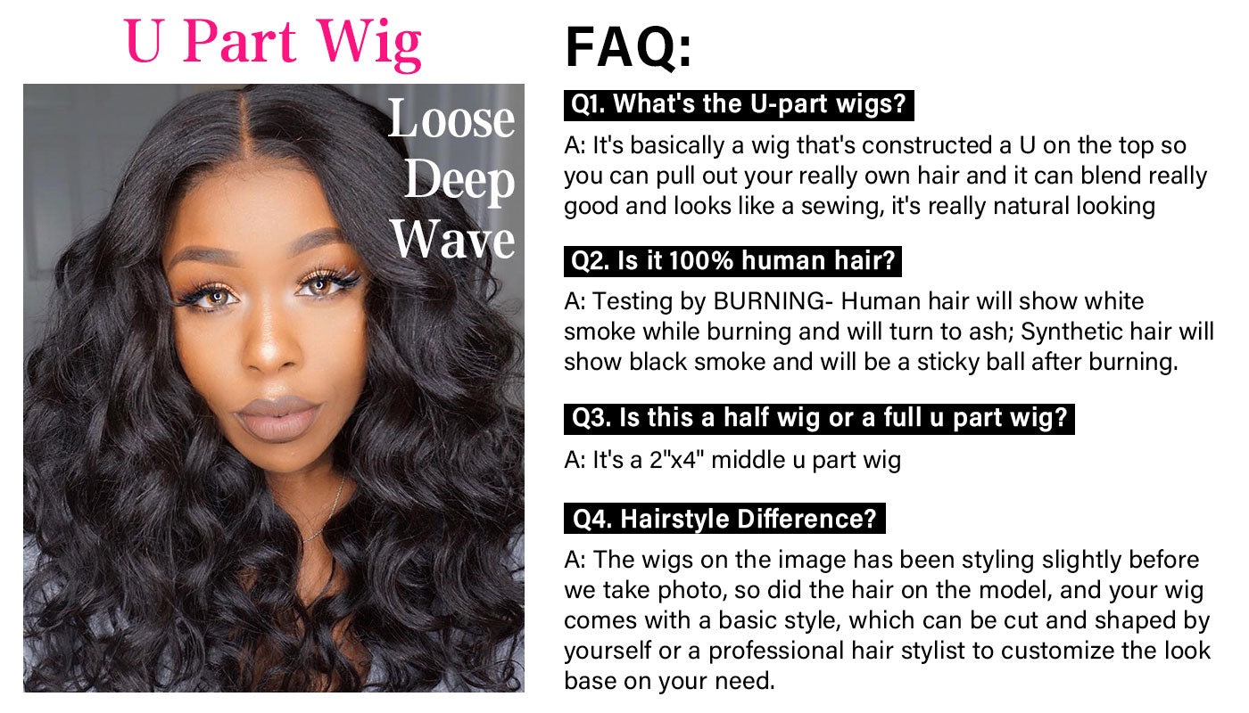 Loose Deep Wave U Part Human Hair Wig for Women, Brazilian Remy Human Hair Glueless Full Head Clip in Half Wig 180% Density